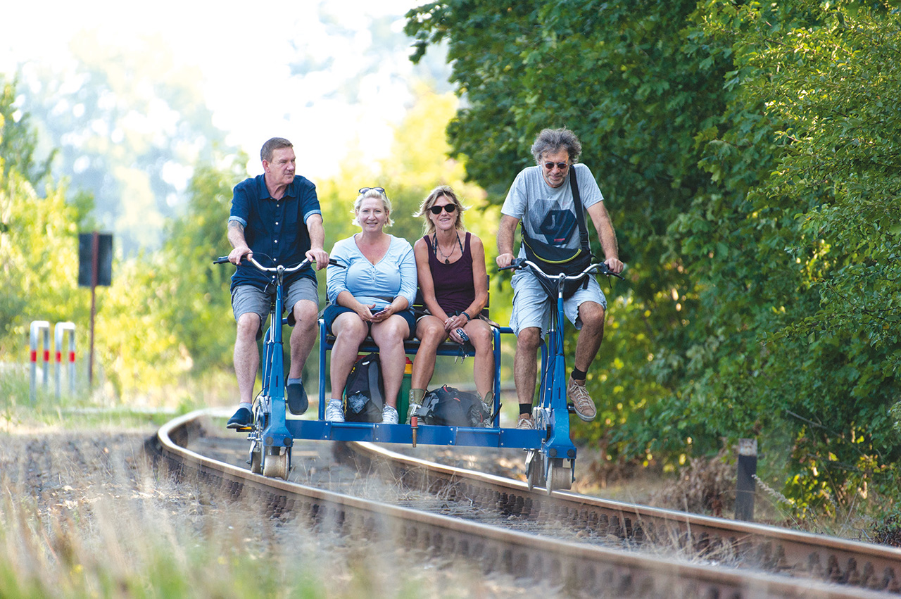 Raus aus dem Alltag, rauf auf die Schiene! Bei unserer Draisinen-Schnuppertour erlebst du mit deiner Gruppe (2 bis 180 Personen) einen unvergesslichen Halbtagesausflug. Tretet gemeinsam in die Pedale und genießt die Fahrt entlang des malerischen Nottekanals.